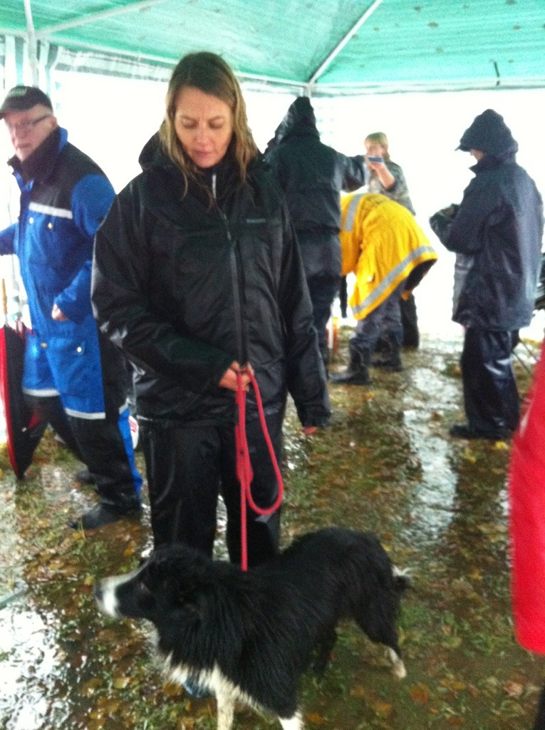 Regnet har öst ner hela dagen och banan blev en sjö – vilket krävde en hund som tryckte och flyttade får. 7 godkända hundar av 16 startande.