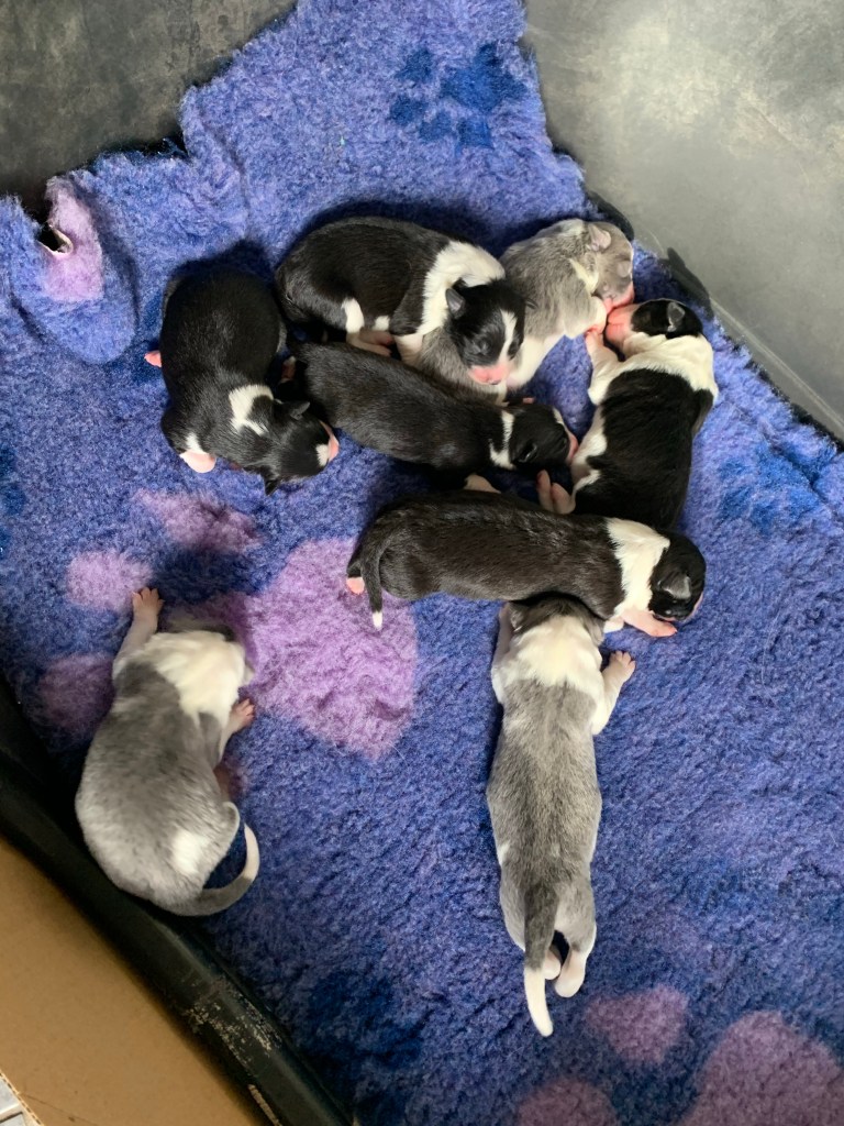 I söndags 16 februari födde Chloe 8 st valpar. Pappa Pen-Y-borough Jack. 6 hanar och 2 tikar blev det och en riktig färgkompott! 3 st är silvergrå, 3 st trefärgade och 2 st svart/vita. Starka och fina valpisar.